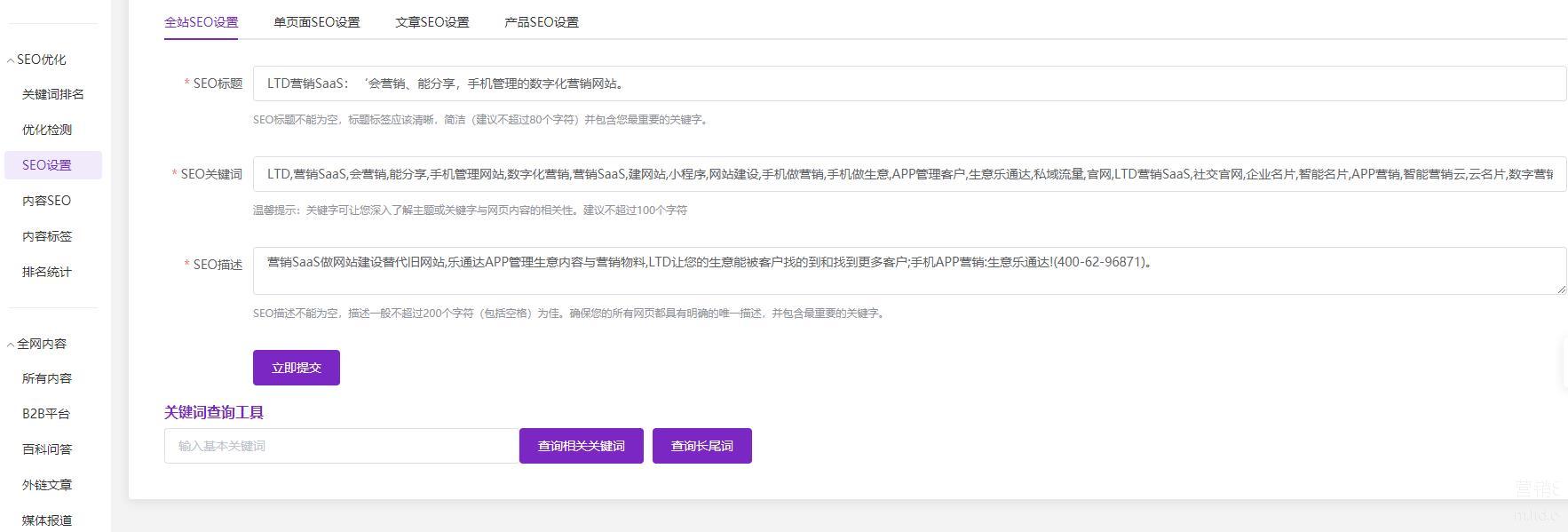 LTD营销SaaS为每家企业提供了完善的SEO优化服务,对企业的生意、业务内容进行表达优化。