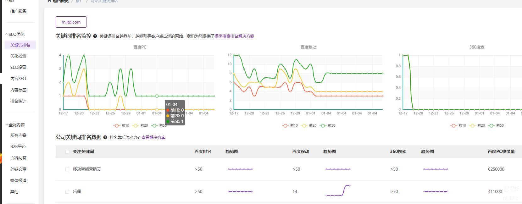 同时,官微中心后台中也可以对SEO优化状况进行检测,实时监控关键词排名趋势,让您及时查看网站的优化进度。