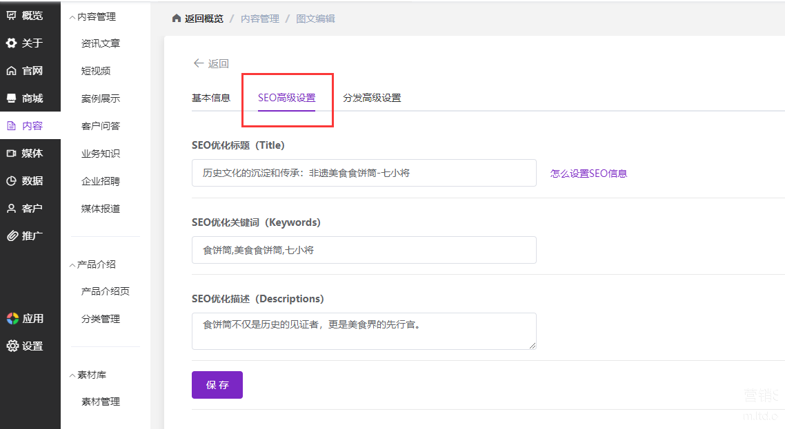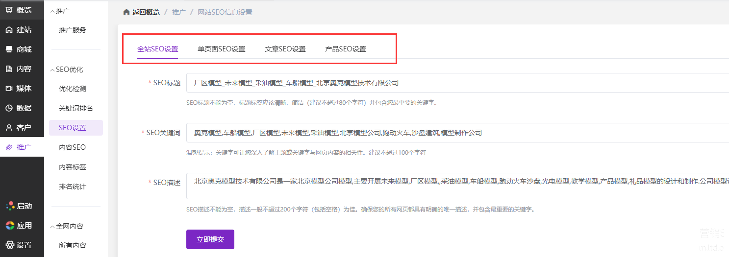 官微中心【推广】——【SEO设置】——【全站SEO设置、单页面SEO设置、文章SEO设置、产品SEO设置】进行关键词布局