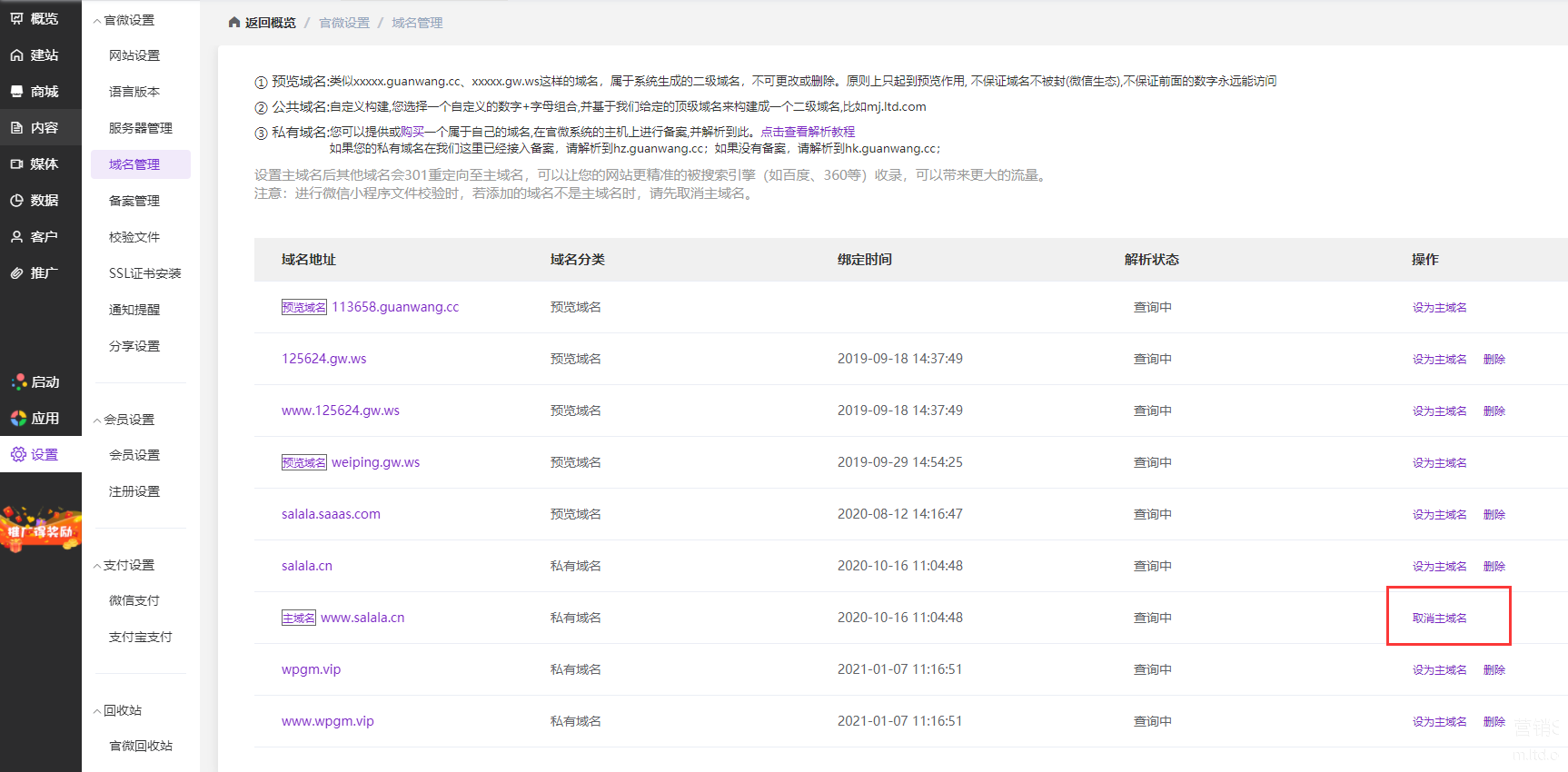 【操作】官微中心——设置——域名管理:可直接选择主域名进行设置,简化操作流程。