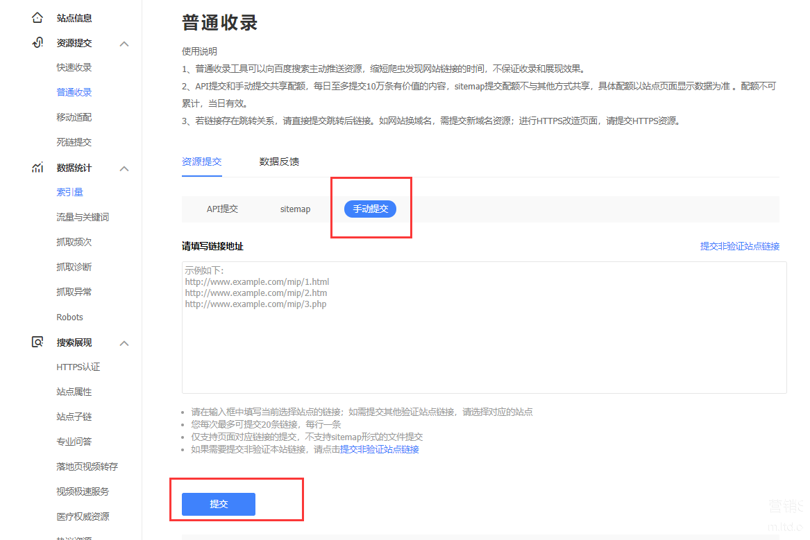 3、手动提交主要栏目页的URL网址