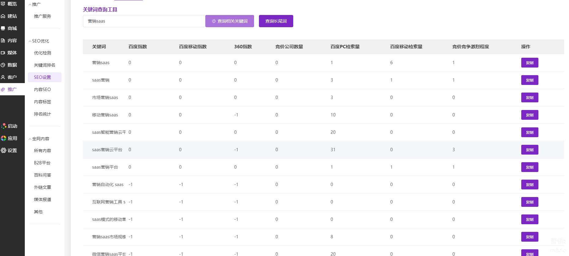 借助官微中心【推广】——【SEO设置】——【关键词查询工具】进行大数据查询、关键词筛选匹配,筛选出适合自己企业的关键词。