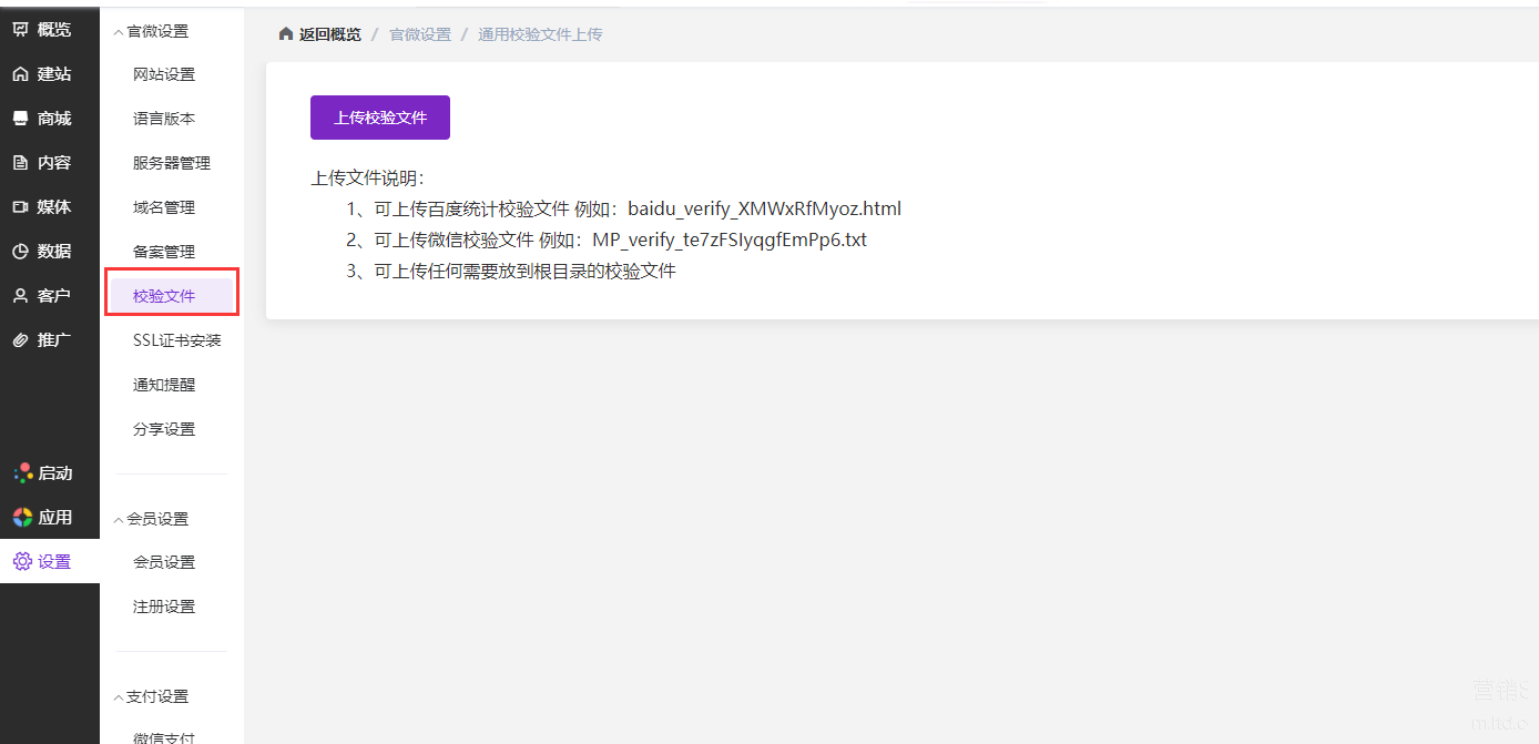 将下载好的验证文件,通过官微中心后台【设置】——【校验文件】进行文件上传,上传好之后返回百度站长平台,点击完成验证即可