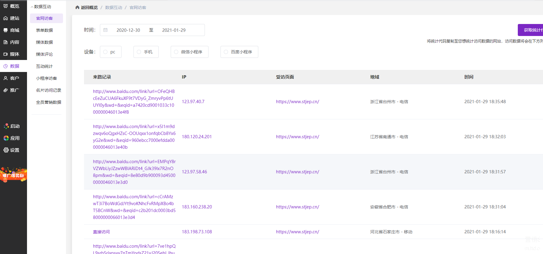 官微中心-【数据】-【官网访客】查看网站每天的流量情况