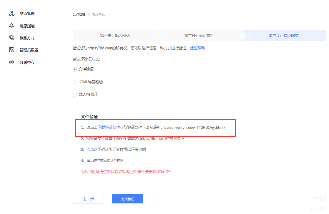 1、绑定百度站长,选择下载验证文件的方式进行验证