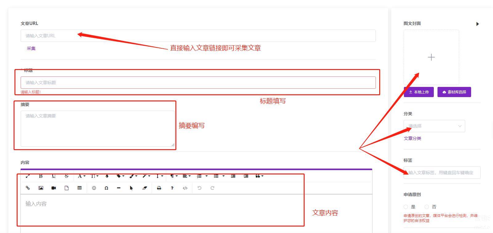 文章的创建界面简洁明了,用户可以通过直接填充内容或者输入URL采集文章两种方式上传:
