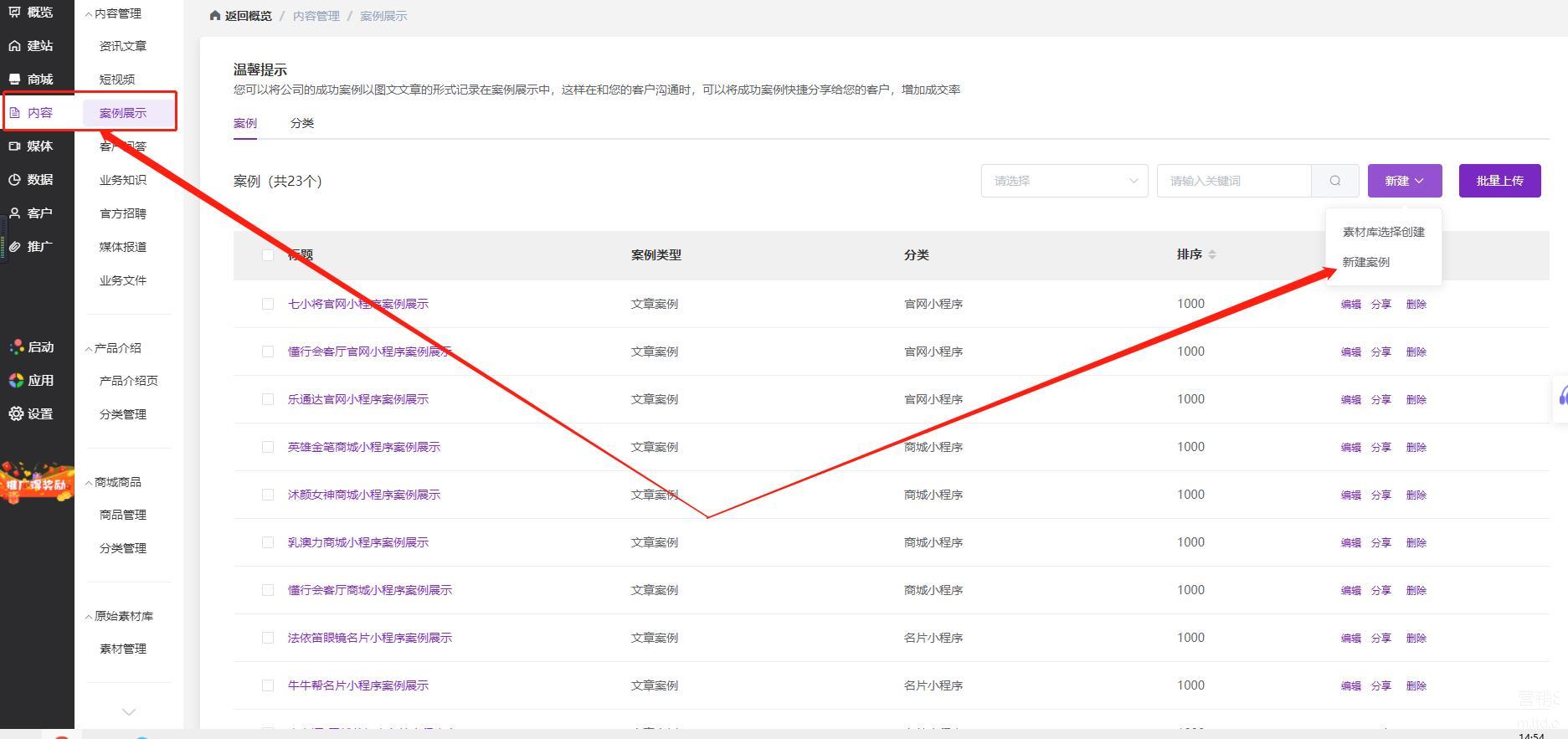 在官微中心中上传客户案例的过程可以参考文章内容上传,选择“内容-案例展示-新建案例”,填写相关内容即可。