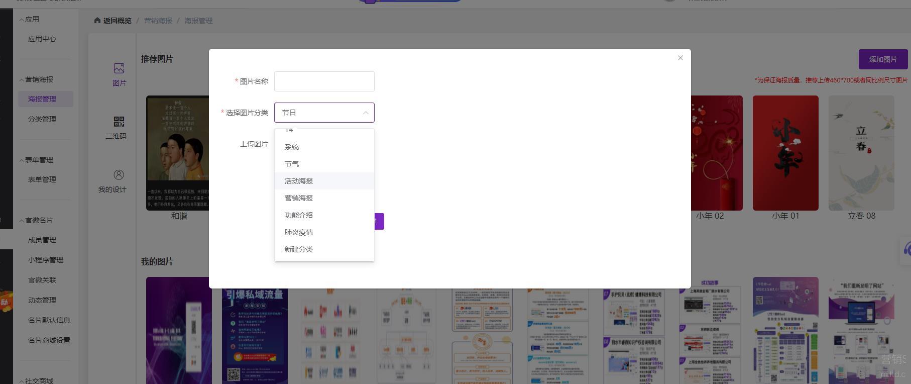 在官微中心中直接选择“营销海报-海报制作”即可开始上传图片作为宣传海报,在后续的宣传过程中也可以随时通过官微中心进行调取。
