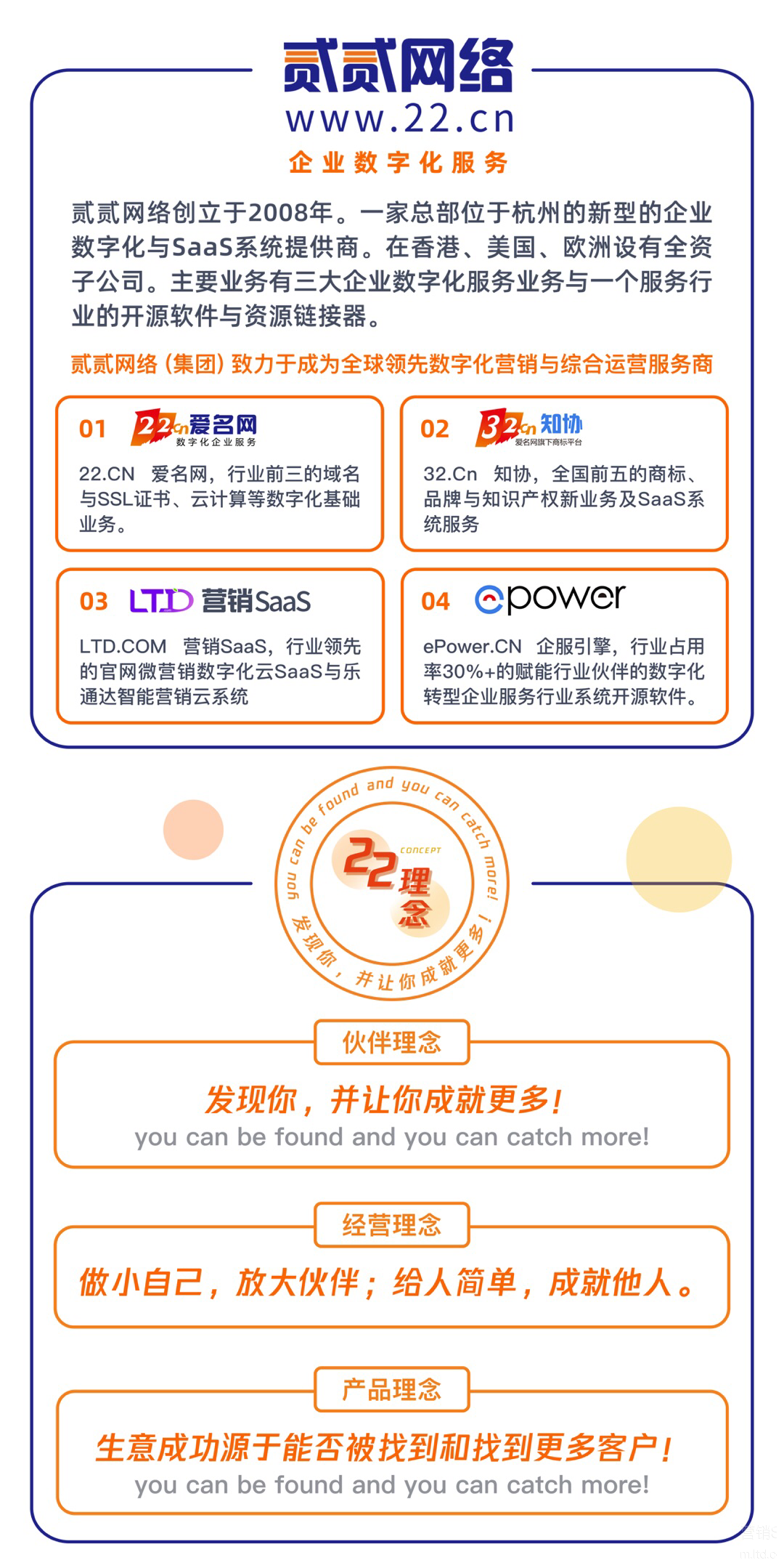 贰贰网络旗下包含三大企业数字化服务业务与一个服务行业的开源软件与资源链接器:爱名网 (22.cn)、LTD营销SaaS (ltd.com)、32知协 (32.cn)、ePower (ePower.cn)