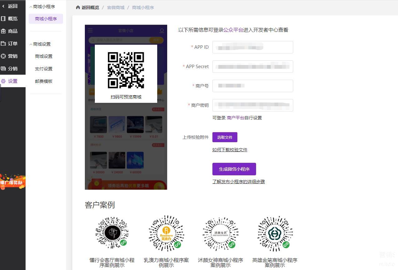 首先,打开官微中心的“社交商城-商城小程序”,进入小程序信息的录入界面;