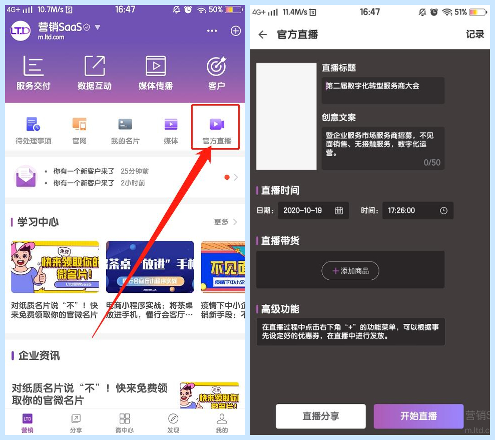 直播文化盛行当下,也是引流的一种方式,所以,LTD营销SaaS可以做到以社交官网为载体,全网直播,轻松获客,轻松引流!