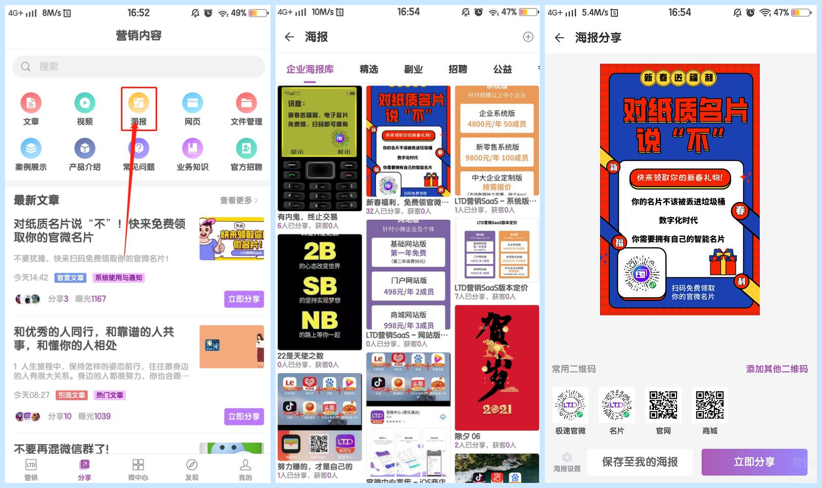 不再是模版乏味的图文形式,而是根据企业特点,私人定制的精美的分享海报,快速分享更好的裂变,搭建私域阵地,将文字与图片完美结合,视觉冲击,海报上可添加名片二维码,让分享成为获客工具,实现裂变引流 的效果!