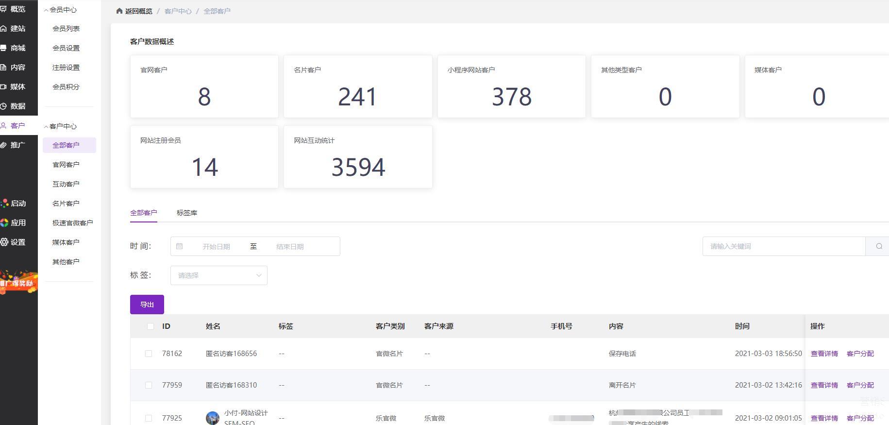 全网营销数据中台,营销数据管理集中,实时管控市场推广效果,全方位统计官网访客、媒体数据、小程序访客、智能名片,全员营销数据,做到全方位的数据归拢,及时获取,及时更新。