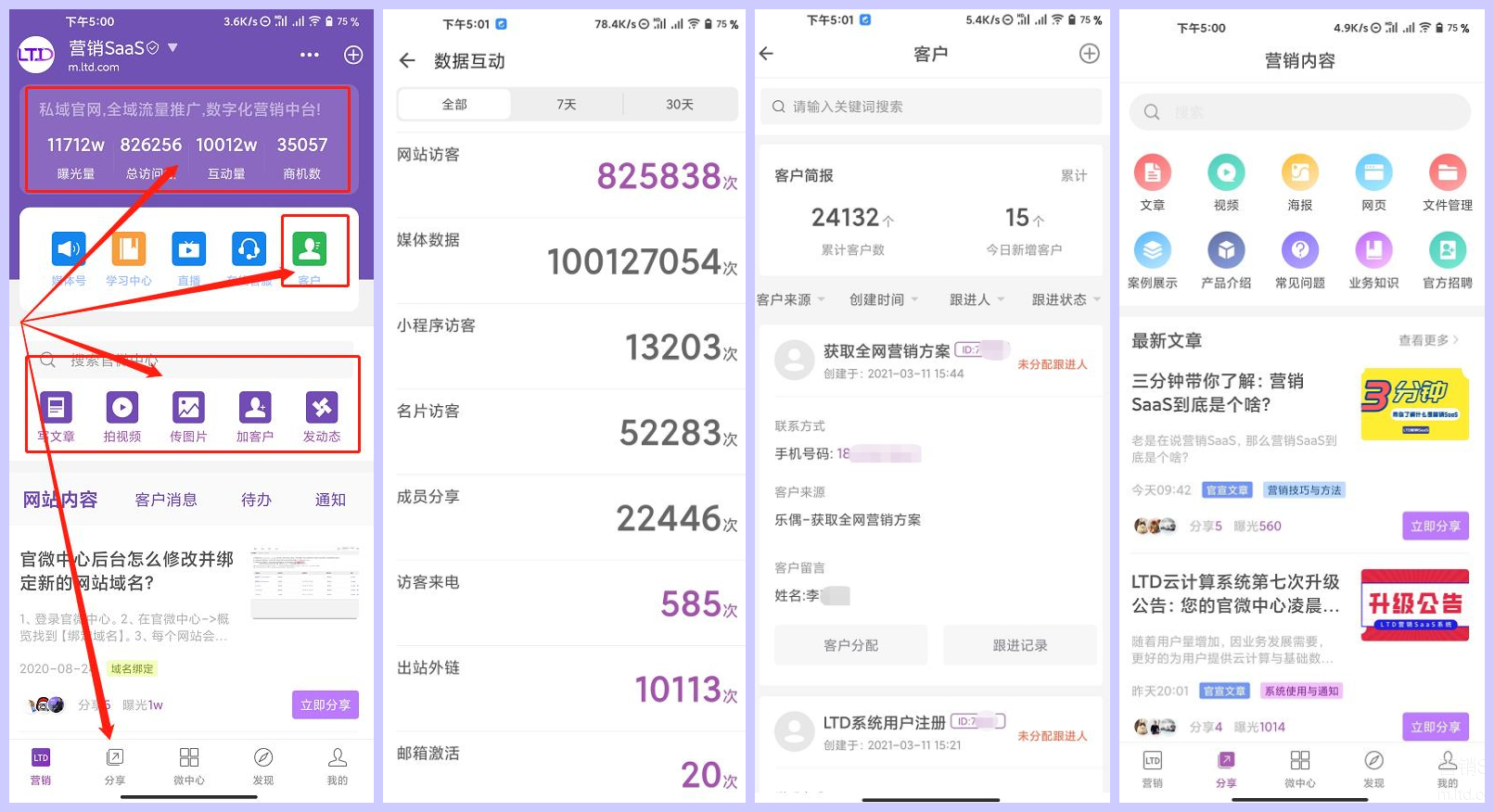 LTD不仅提供PC端的官微中心,同时也提供了移动端的使用途径,手机下载官微中心App,即可在掌上完成物料分享、成员管理、商城搭建、线索归集、数据统计等操作,真正实现一个手机即可做到的数字化营销管理。