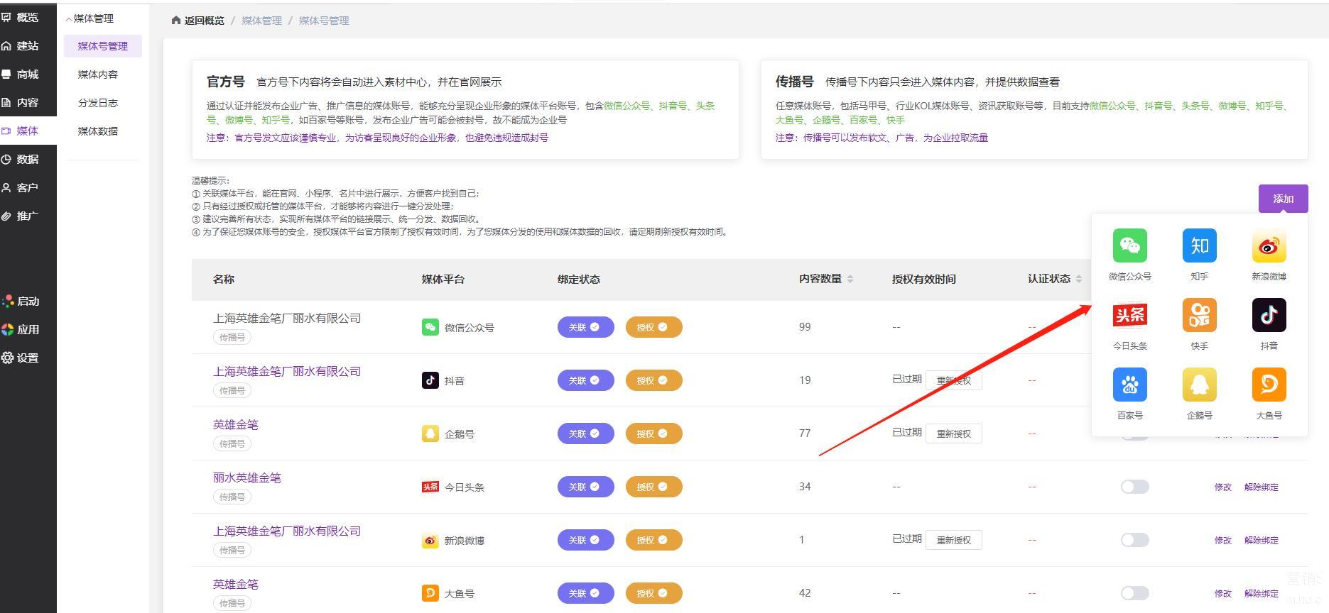 在通过LTD完成建站后,企业可以通过官微中心关联各大媒体号,即可以自身的独立官网为中心,建立自媒体账号、社交媒体账户矩阵。