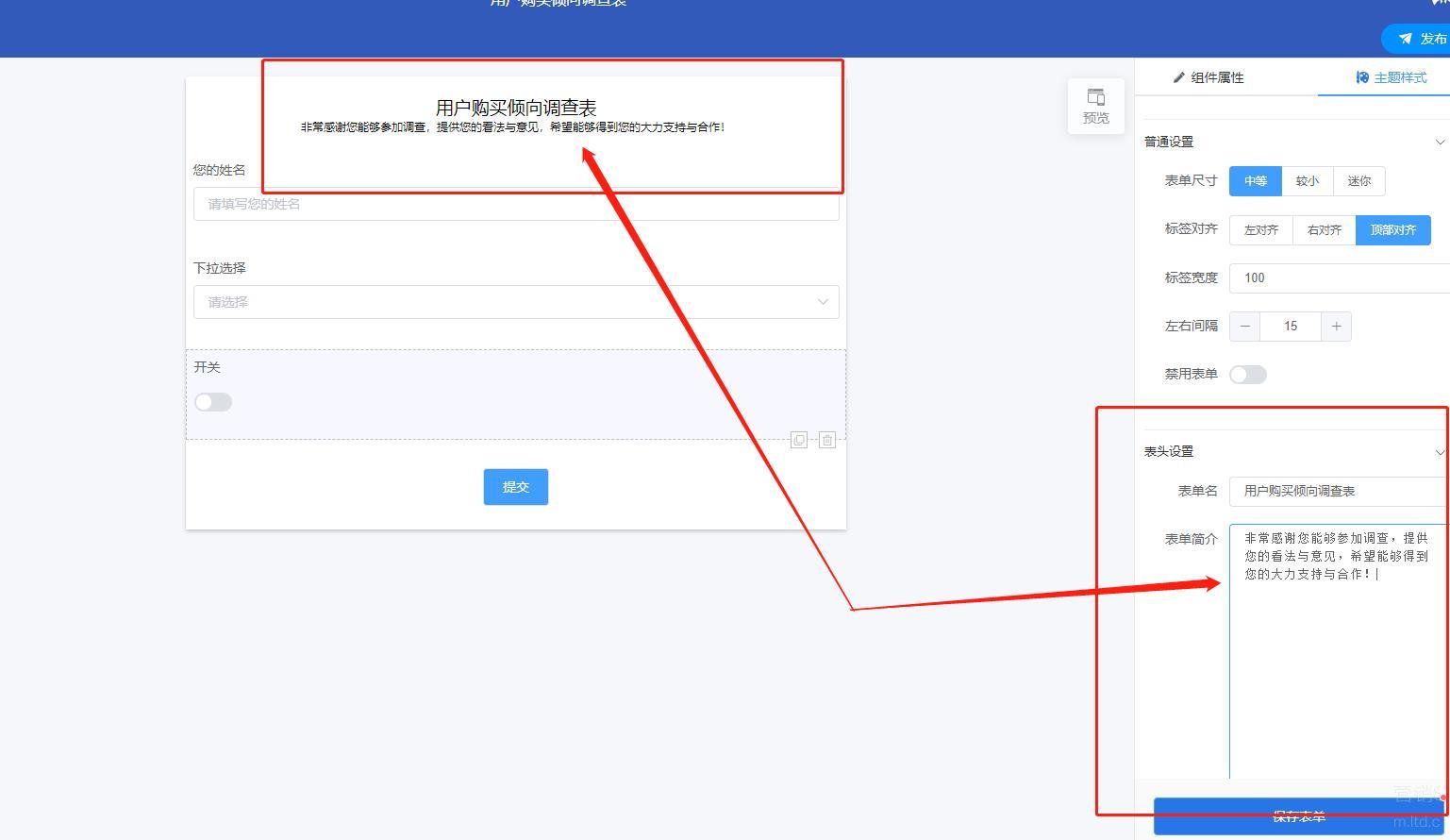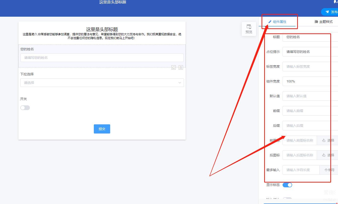 整个表单的表头设置也在这一栏中,点击任意组件的主题样式都可对其进行修改;