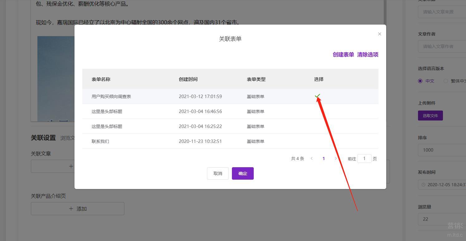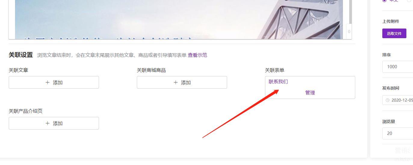 另外,表单的另一个重要用途就是直接添加在上传的文章或者其他物料下方,选择“关联表单”,选中我们之前编辑好的表单即可。
