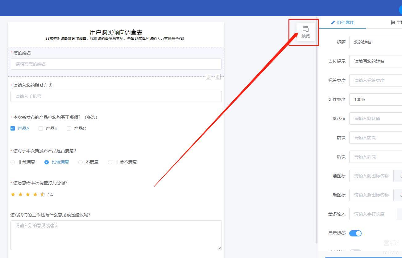 在完成了表单后,可以点击“预览”选项,在保存后进行整体效果预览;