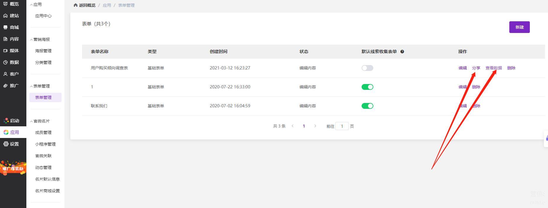 添加好的表单可以在“官微中心-应用-表单管理”中进行链接或是二维码分享,同时,也可以在这一栏直接查看表单所收集的数据;