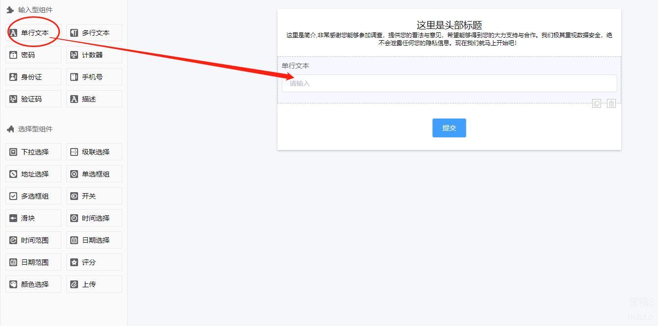 打开编辑器后,在左侧可以看到能够添加到表单中的组件,这里分为“输入型组件”与“选择型组件”;
