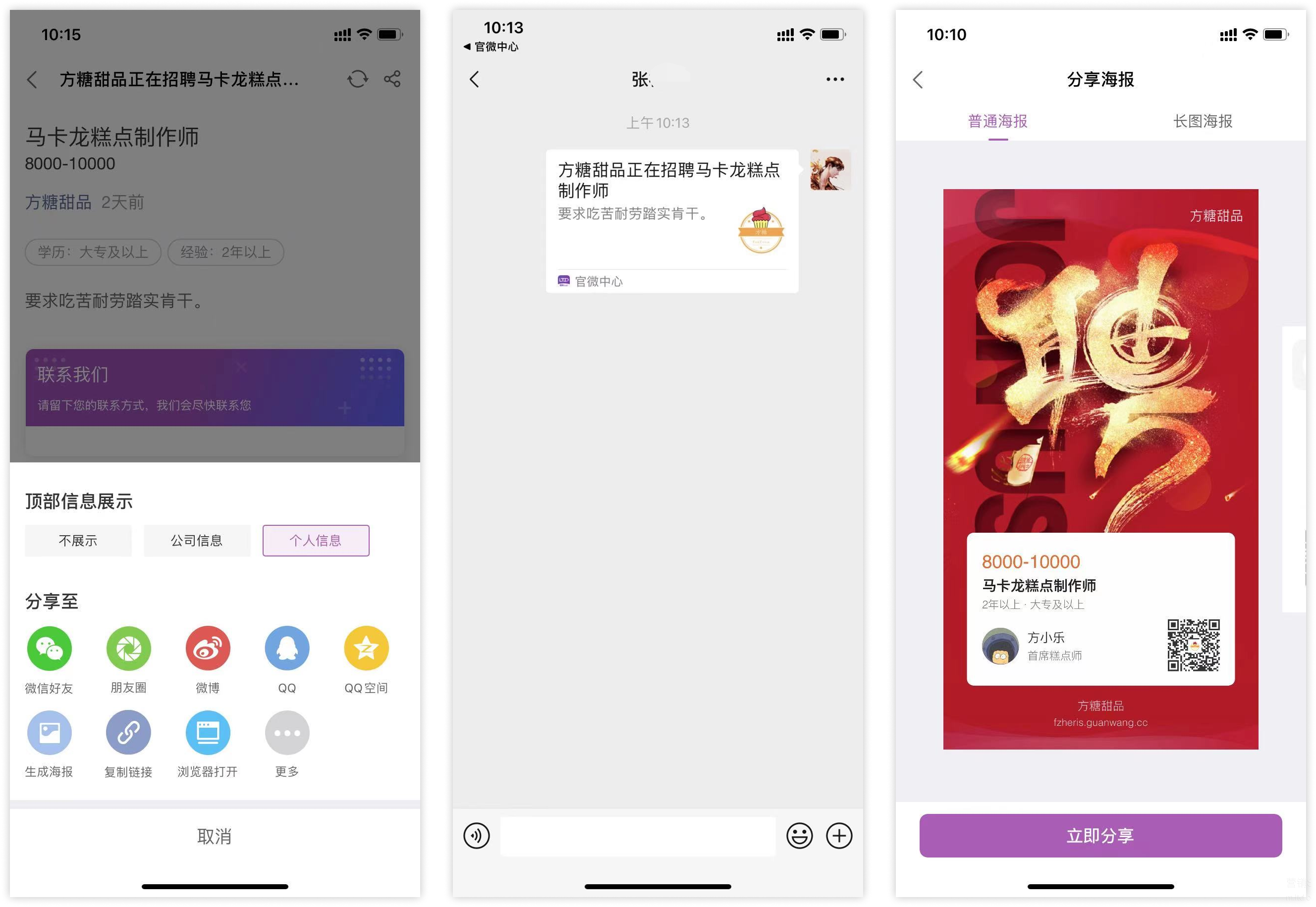 我们可以在招聘信息的下方看到“立即分享”,点击即可将这则招聘信息转发至自己的微信、朋友圈、新浪微博、QQ等社交平台上,轻松完成招聘宣传;