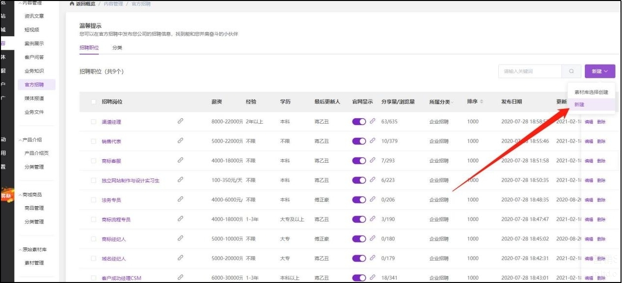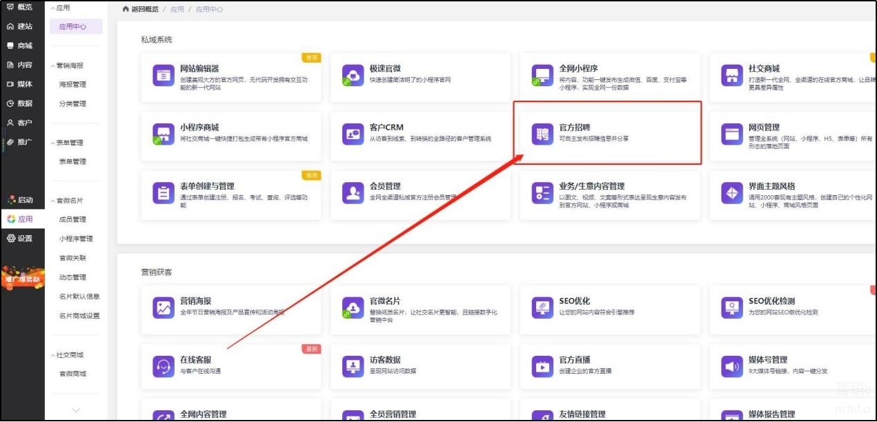 首先,我们先打开官微中心,选择“应用-官方招聘”,点击新建招聘信息;