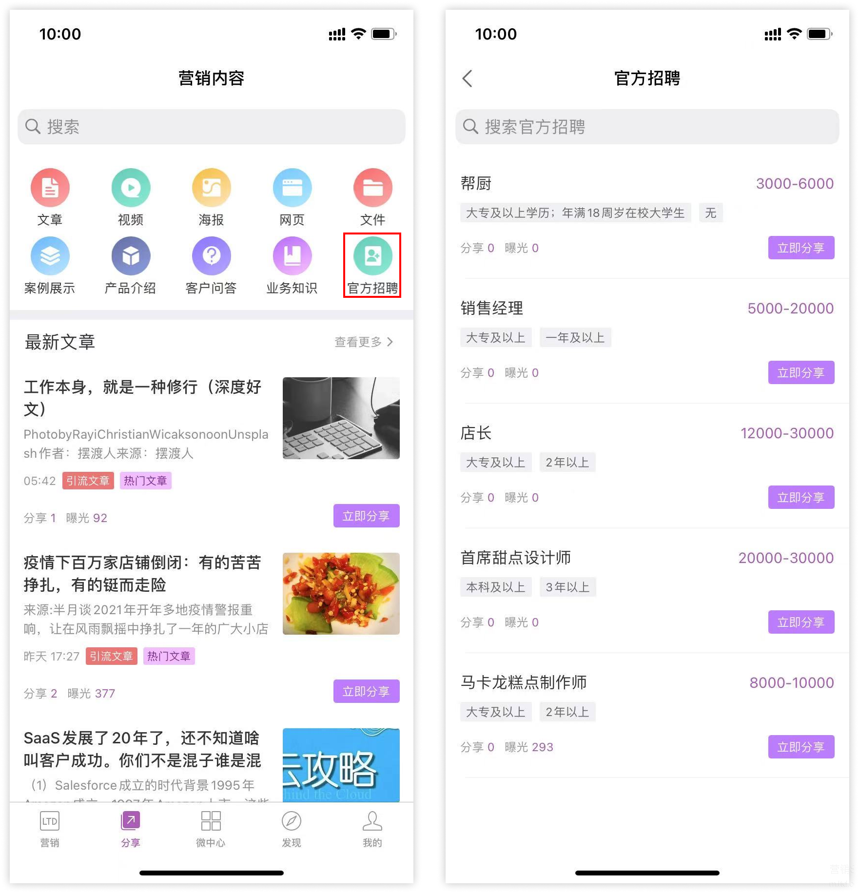 前不久一家企业就用了一个“奇招”,他们通过LTD官微中心的招聘信息功能,将每一个企业成员的手机官微中心App当做宣传平台,把企业的招聘广告直接裂变式地扩散了出去。