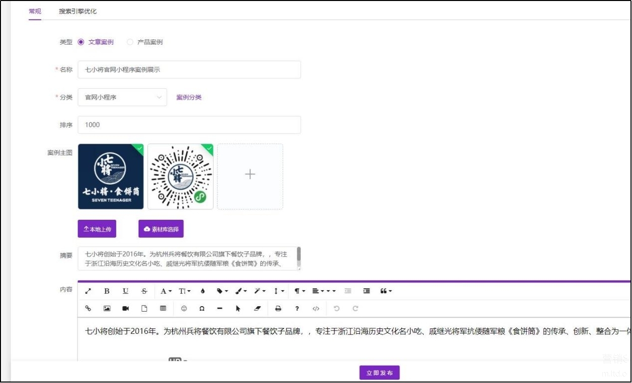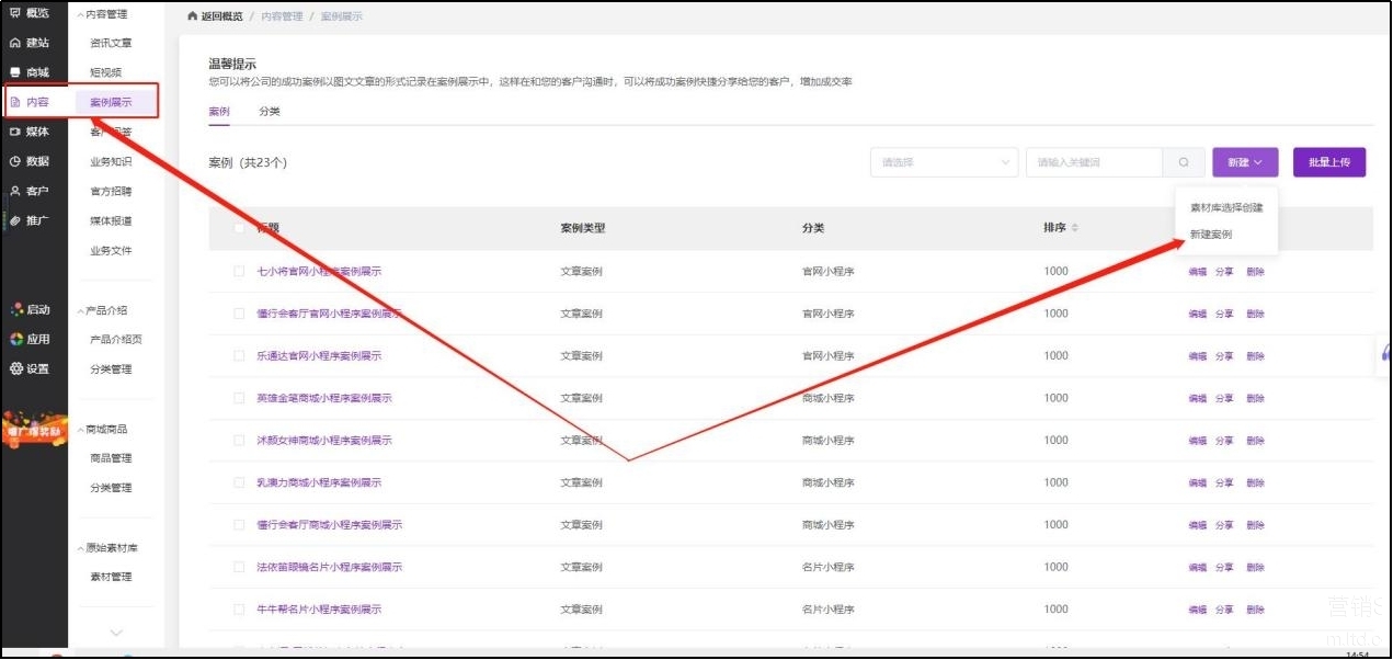 在官微中心中上传客户案例的过程可以参考文章内容上传,选择“内容-案例展示-新建案例”,填写相关内容即可。