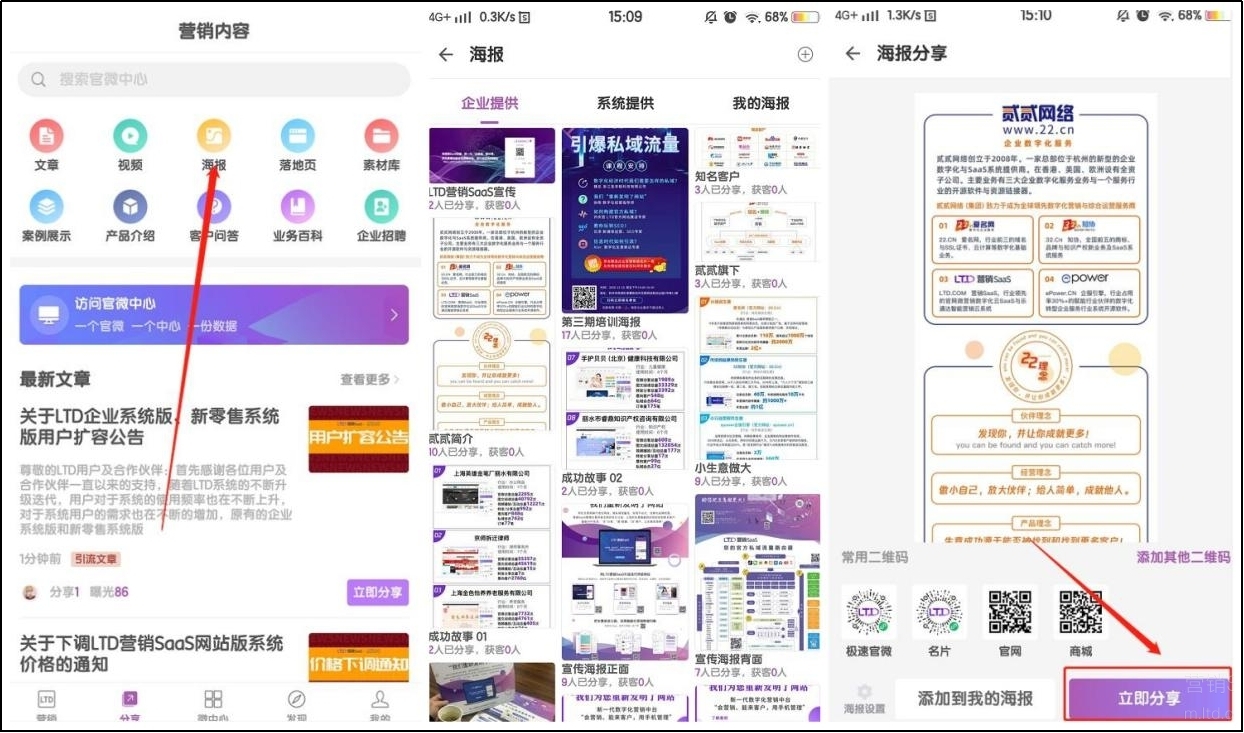 当然,通过手机官微中心APP同样也可以进行海报上传、一键分享。