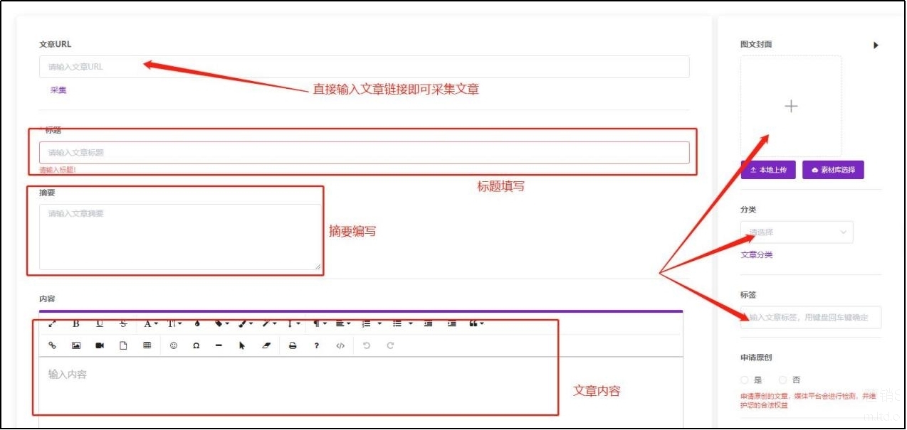 直接填充内容只需按照提示填写相应资料即可,采集文章则需要复制文章的链接粘贴至“文章URL”框内采集即可。