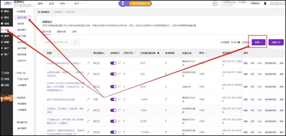 文章内容是独立网站生意内容表达的最主要形式之一,使用LTD营销SaaS官微中心,企业可以轻松将文章内容上传。