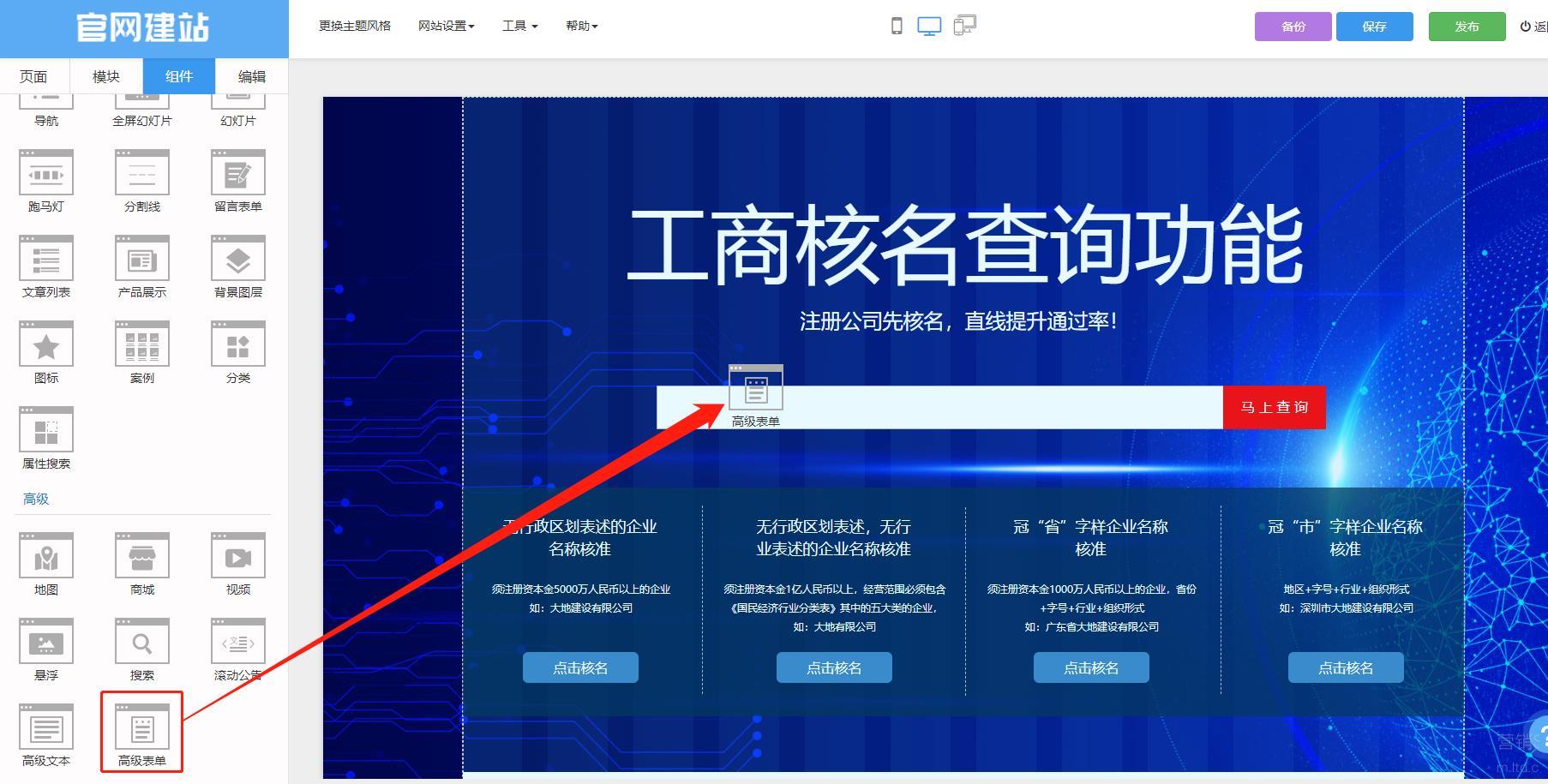 在左边的组件栏中选择“高级表单”,同样直接拖拽至需要插入表单的位置;