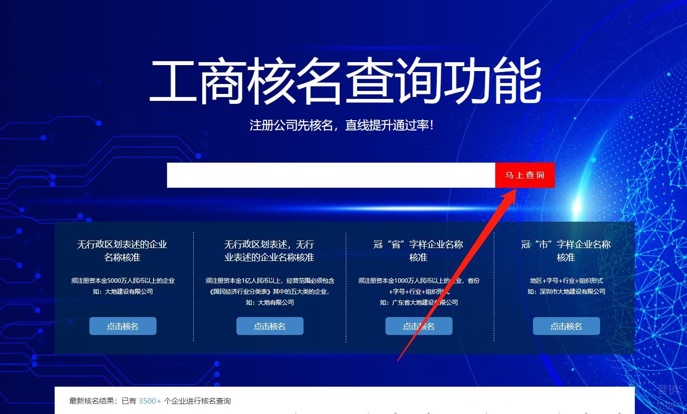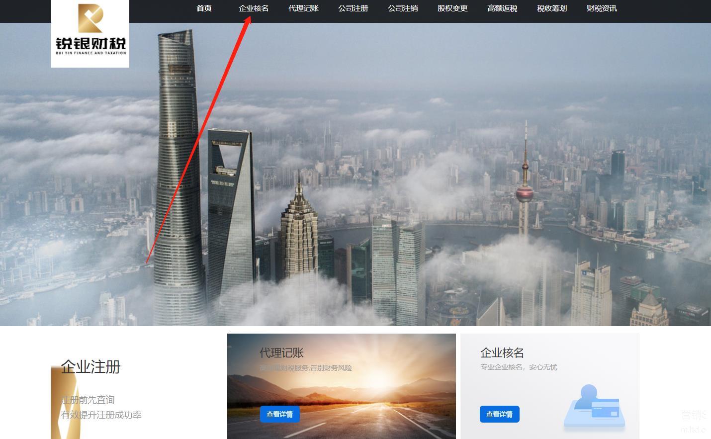 点开锐银财税的企业官网,我们可以看到上方导航栏的“企业核名”,点击进入后就可以看到锐银财税的企业工商核名查询界面了;
