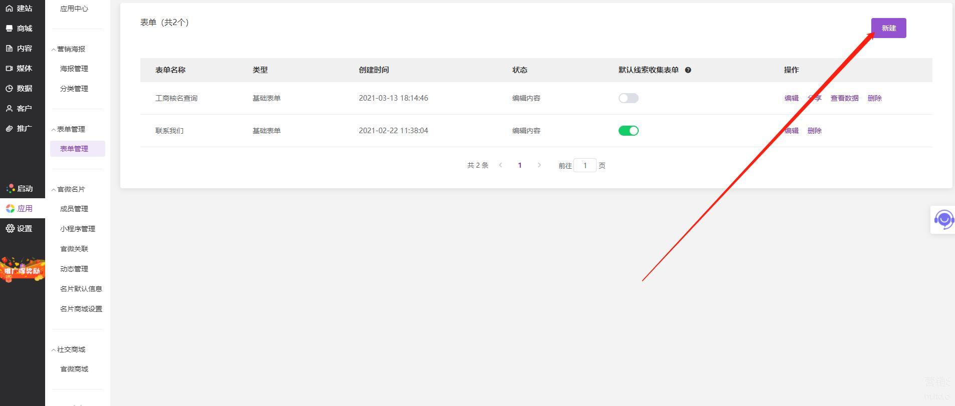 打开功能表单设置列表后,我们可以在这里删除或是编辑已有的表单,这里我们选择新建表单;