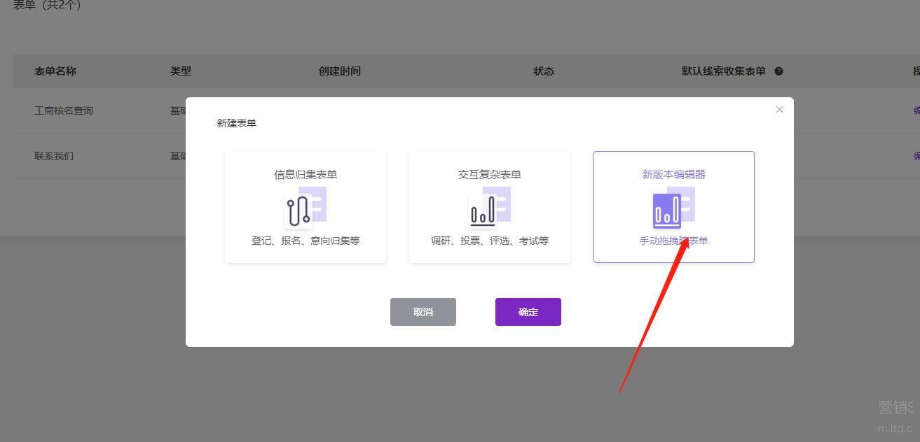 像这种功能全面的表单,我们需要选择“新版本编辑器-手动拖拽建表单”;
