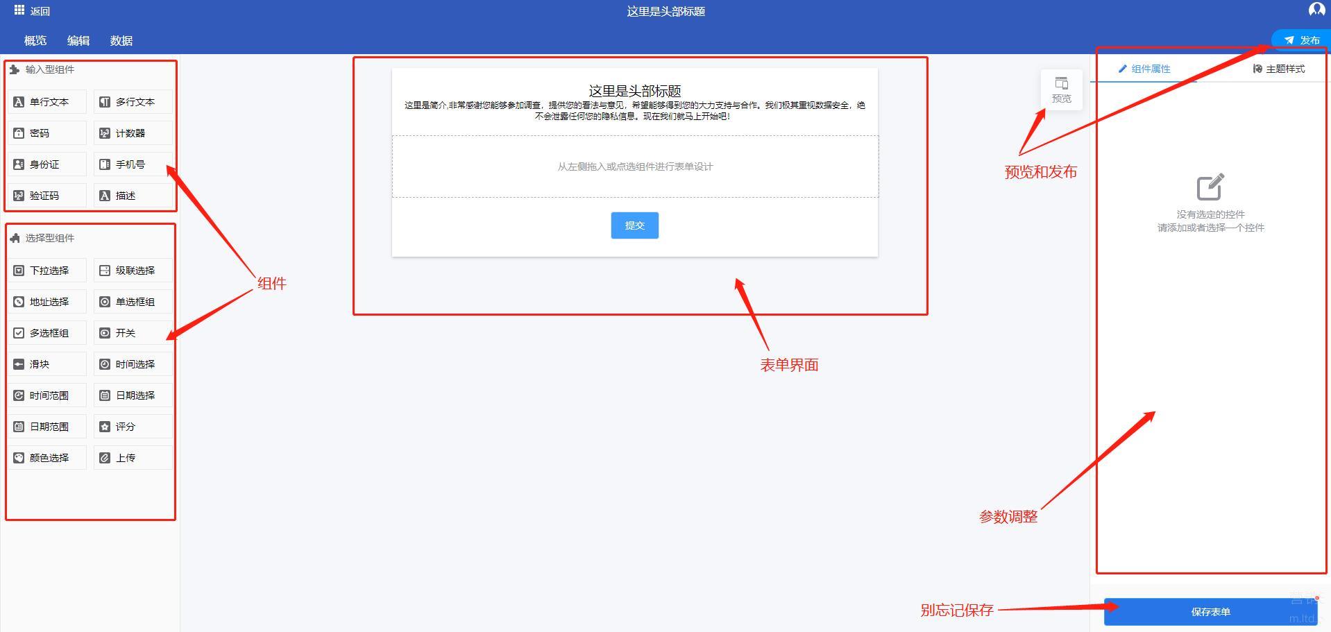 完成表单编辑后,可以选择“预览”观看效果,最后记得点击“保存表单”和“发布”。