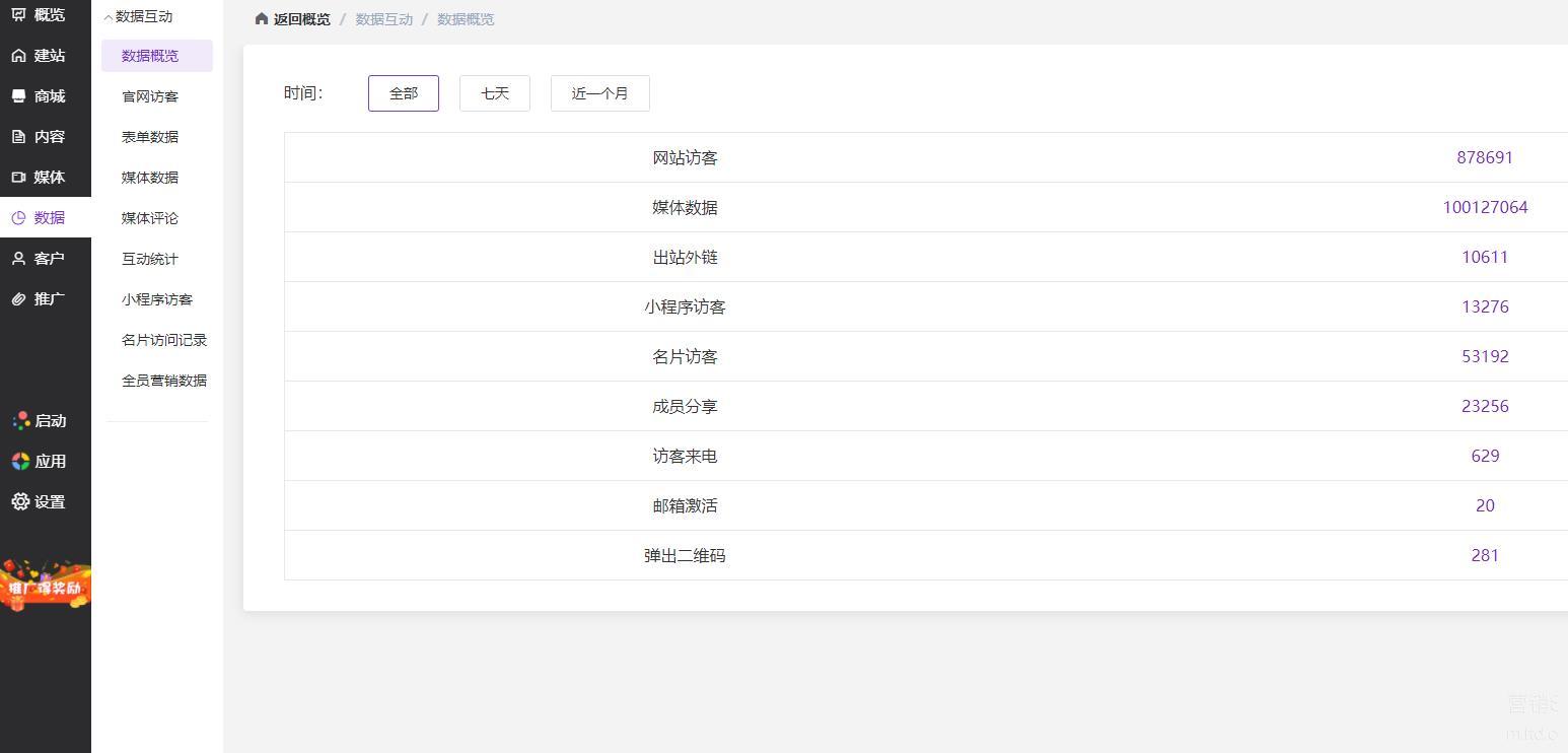 一个数字化营销中台必须要具备数据可视化的能力,企业可以通过LTD营销中台实时收集官网访客数据、媒体数据、小程序访问统计、智能名片访客数据等线索数据。