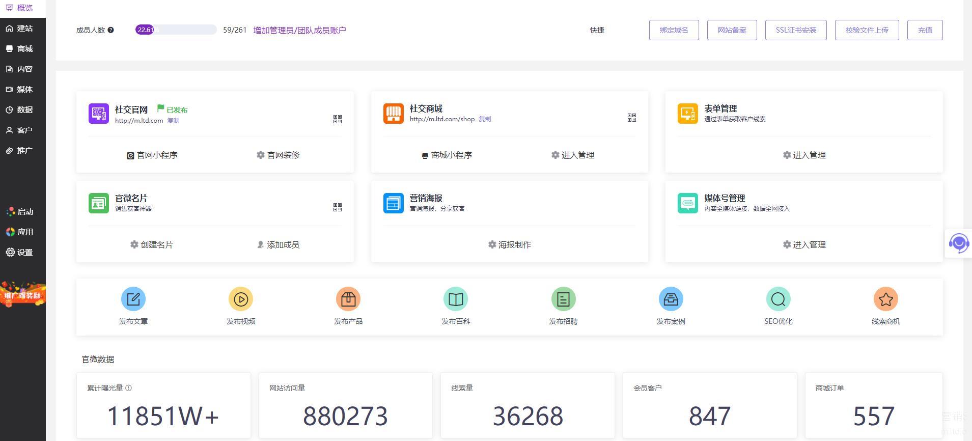 在通过LTD营销中台搭建好独立站后,企业可以将官网链接各大主流媒体,营销内容可以一键分发、统一管理。
