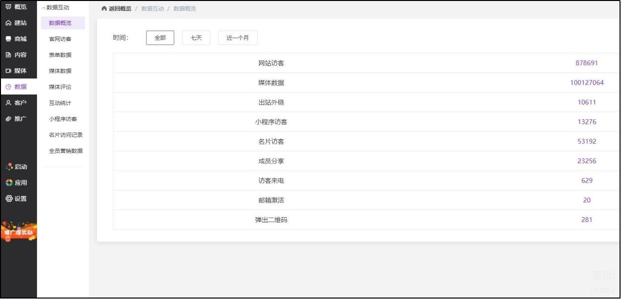 一个数字化营销中台必须要具备数据可视化的能力,企业可以通过LTD营销中台实时收集官网访客数据、媒体数据、小程序访问统计、智能名片访客数据等线索数据。
