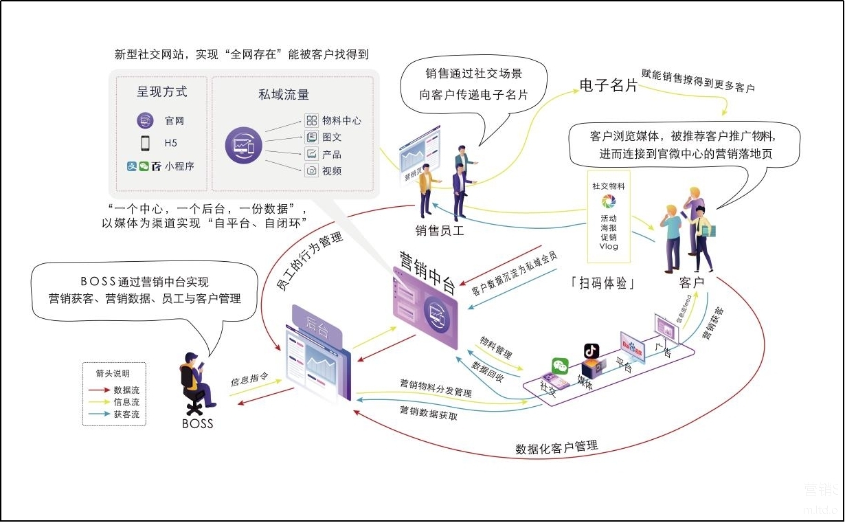 结合当下“数字化营销中台”的理念,企业的“官网”应当具备智能名片、在线表单、营销物料分享、全员营销以及客户管理等功能,而非局限于过去单纯用于展示和简单交互的“门牌号”。