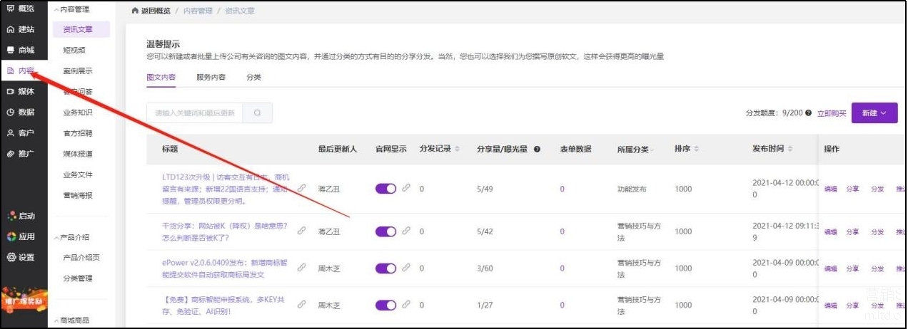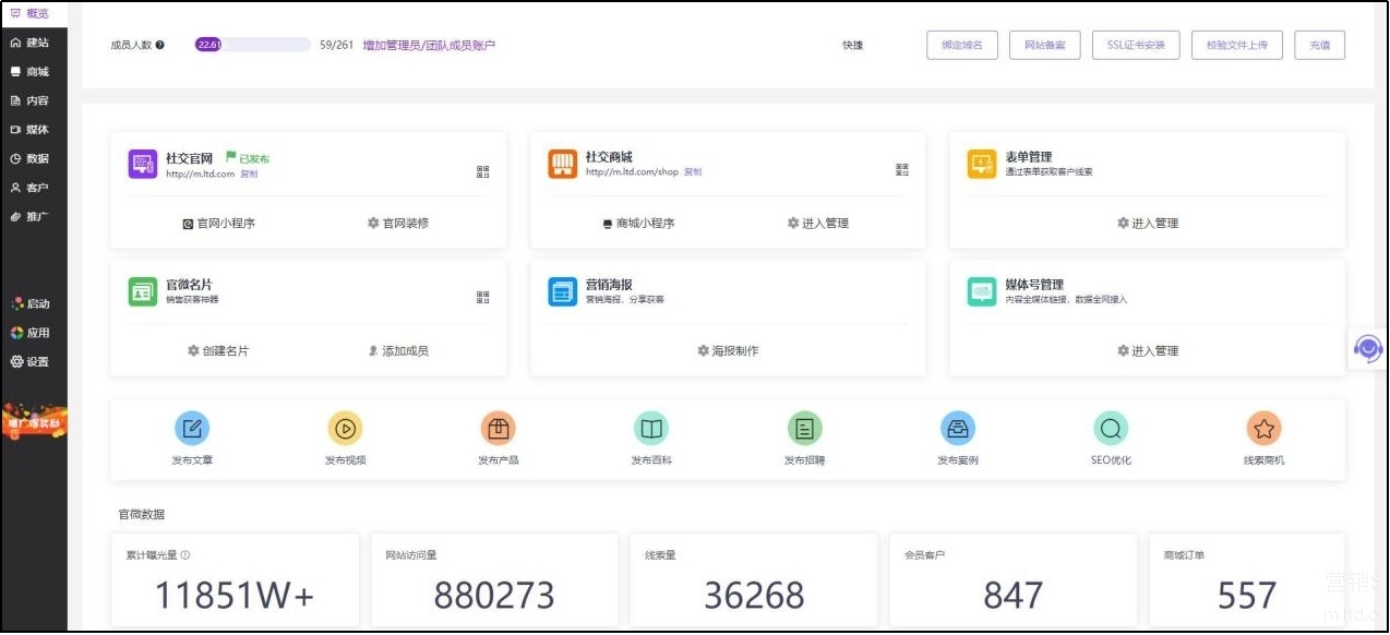 不仅如此,通过LTD营销中台搭建好营销型官网后,企业可以将官网链接各大主流媒体,营销内容可以一键分发、统一管理。