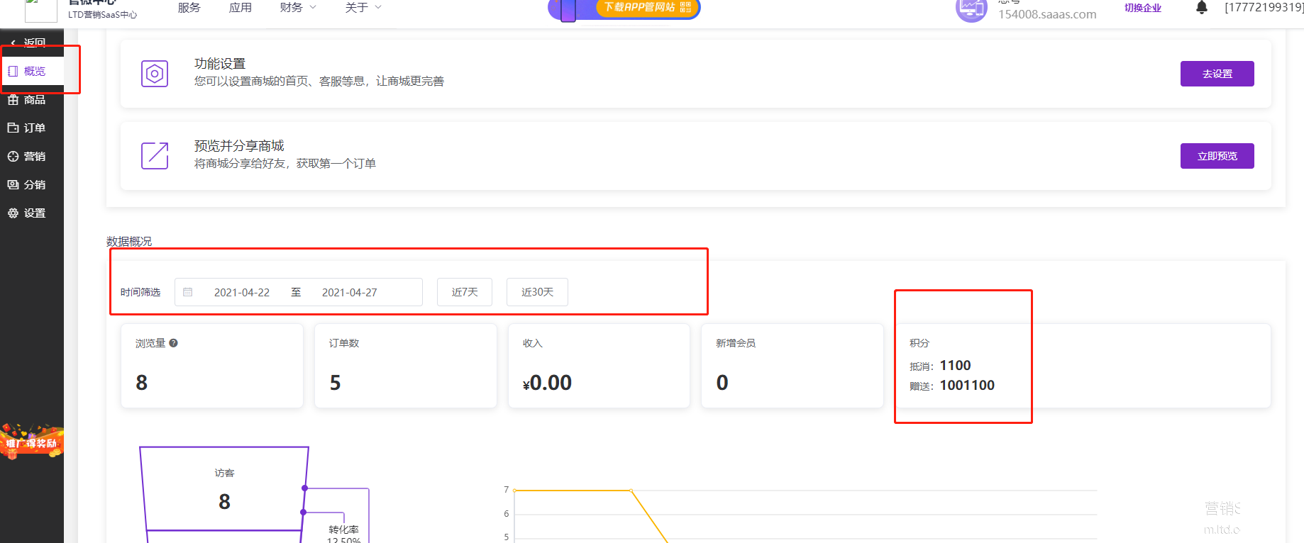在商城首页,可以根据时间范围自定义查询全站总的积分收支情况详情。