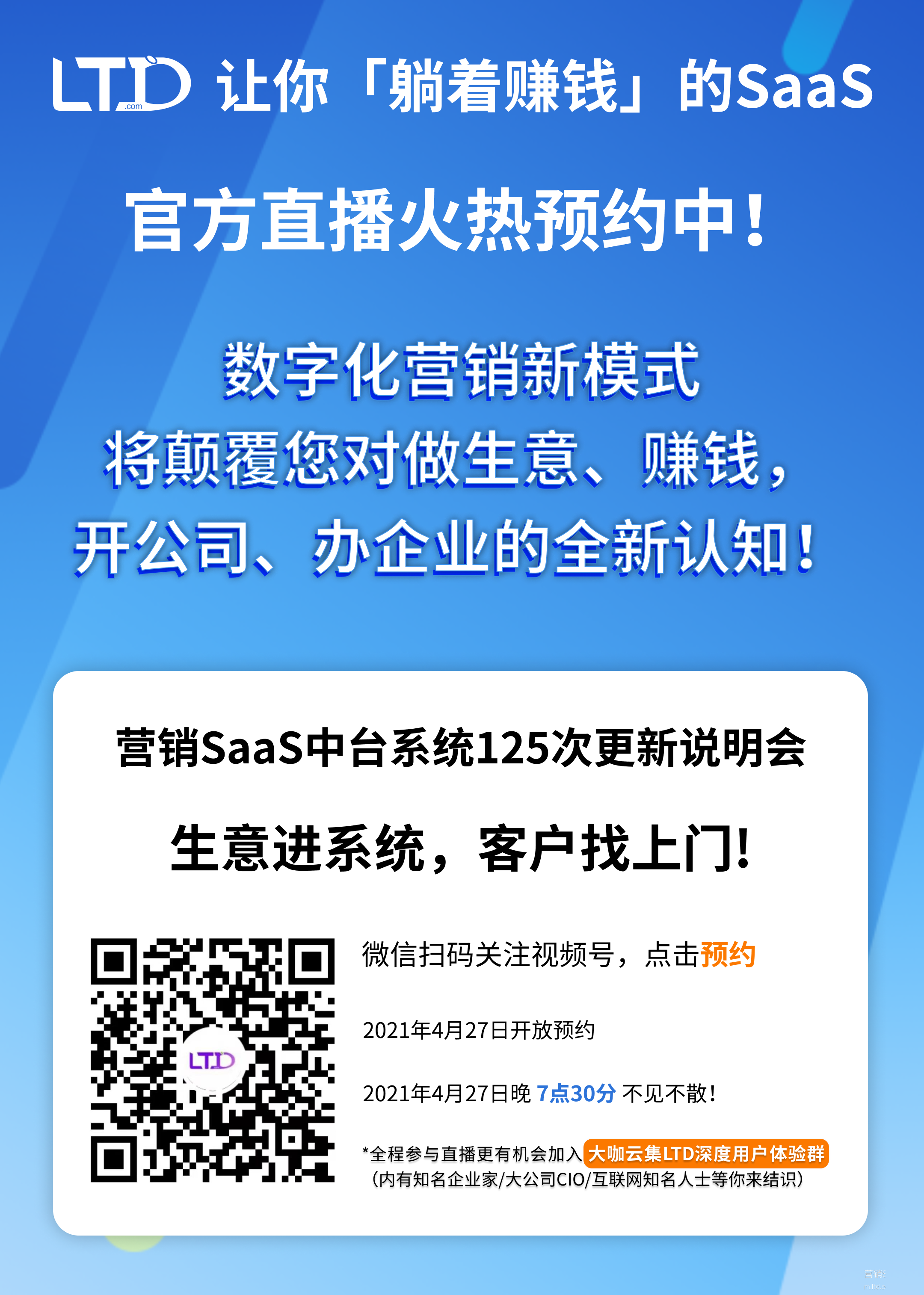 今晚7点半,营销SaaS中台系统125次更新说明会在营销SaaS视频号准时开播!