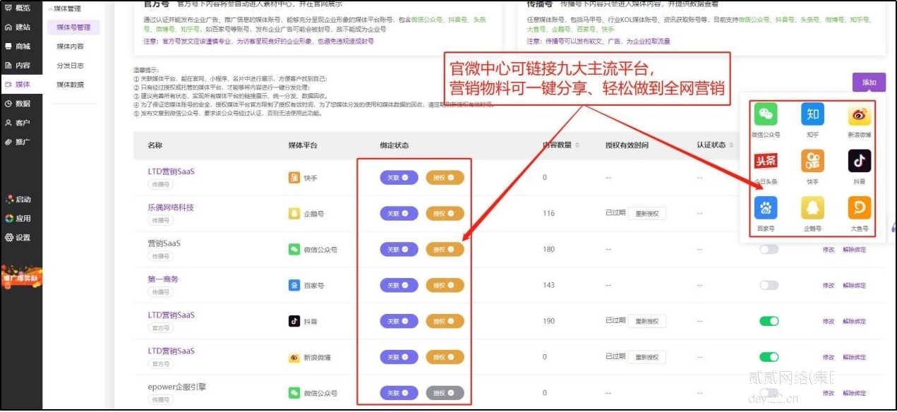 这里以LTD营销中台为例,作为一个具备全网营销功能的营销SaaS系统中台,LTD营销中台可以链接其他九大主流媒体平台,营销物料一键分发,全网营销更轻松;