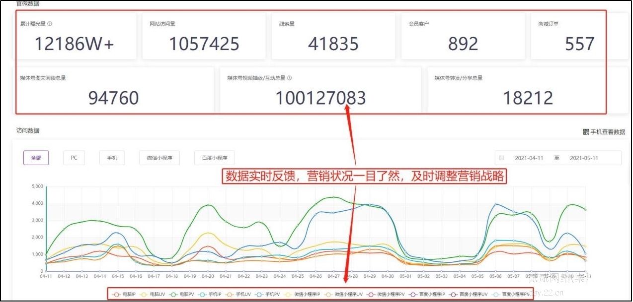 企业通过LTD营销中台搭建好官网营销平台后,无论是官网、小程序还是媒体平台、智能名片产生的客户线索全部都能归集到LTD官微中心后台,数据实时反馈,分析管理透明化,便于及时调整营销战略;
