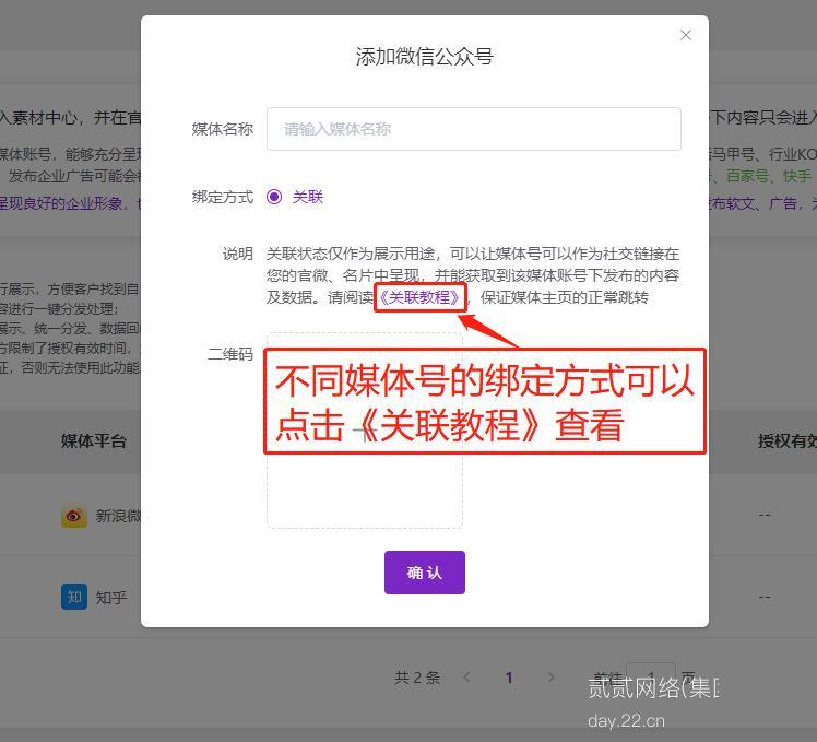 点击对话框中“关联教程”可查看不同类型的媒体号的绑定方式,这里我们以微信公众号二维码获取为例: