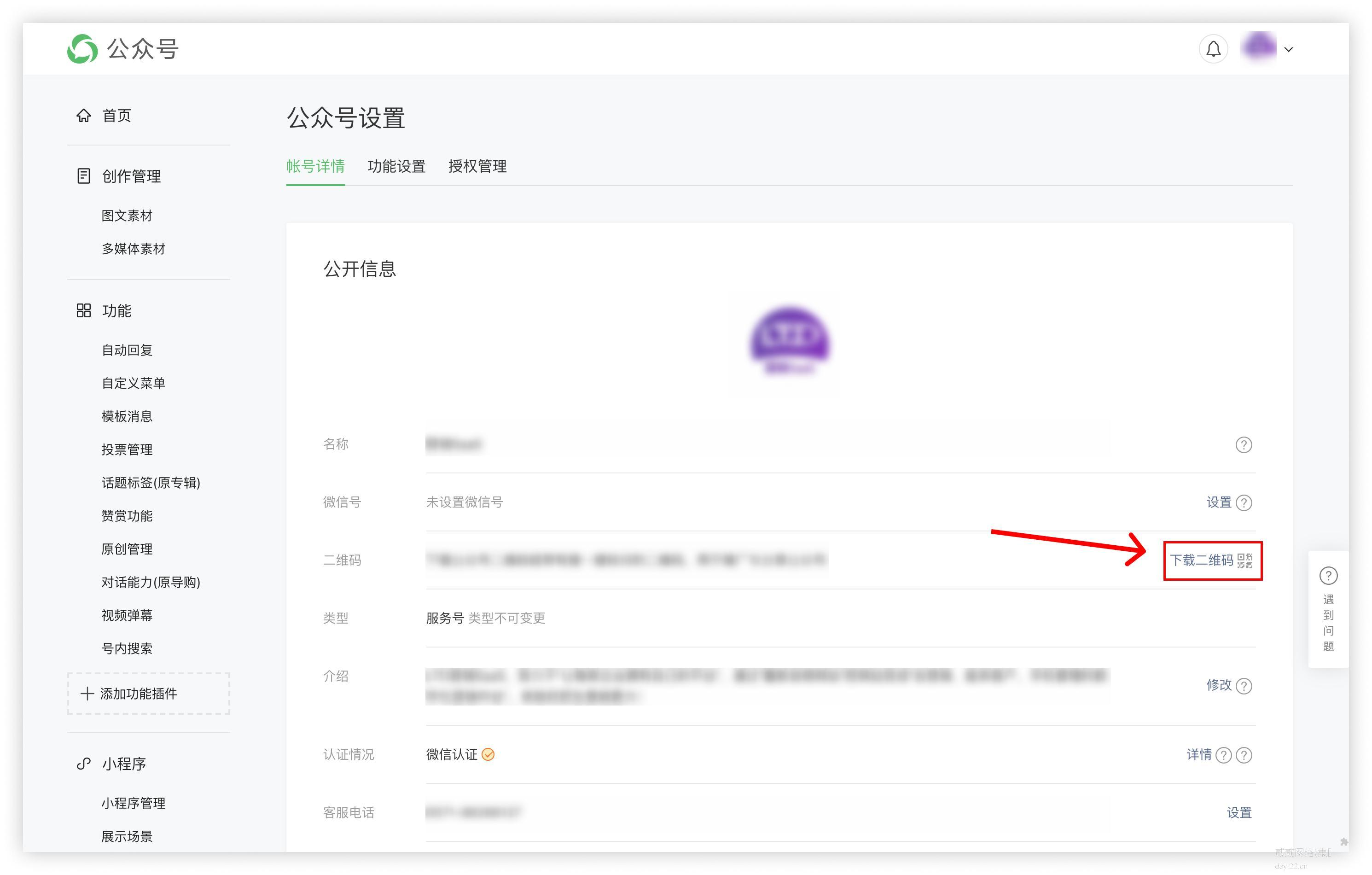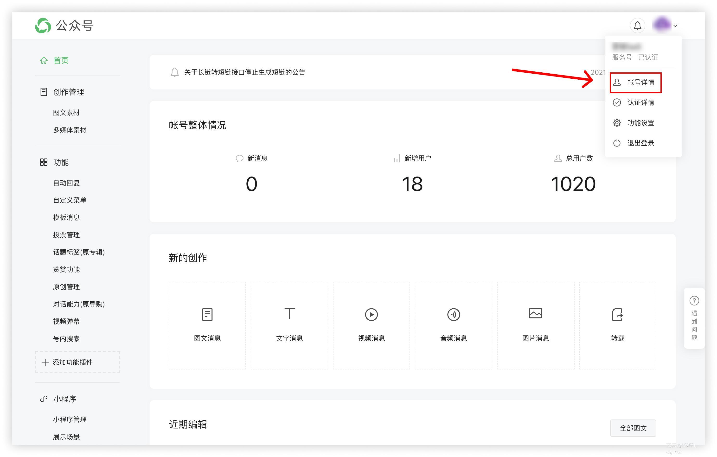 首先,登录到企业的微信公众号后台,点击右上角头像,选择账号详情;