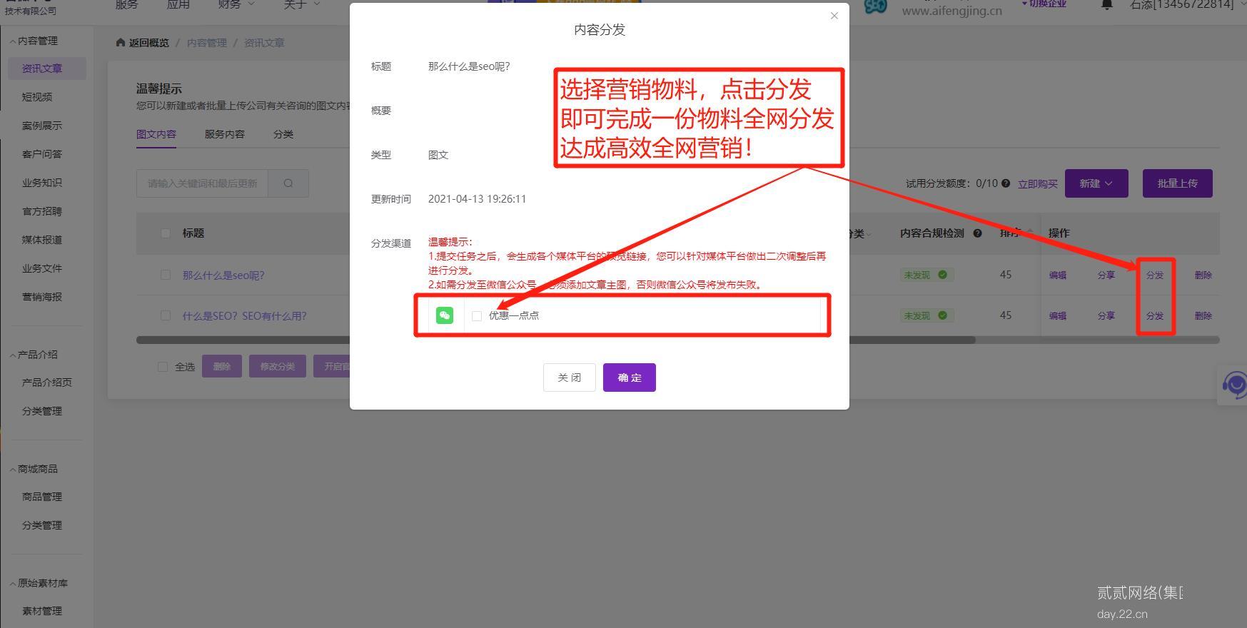 完成了关联并授权媒体号后,在“内容”模块中选择你想分发的营销物料,点击“分发”后,勾选需要分发的平台即可完成一键分发。
