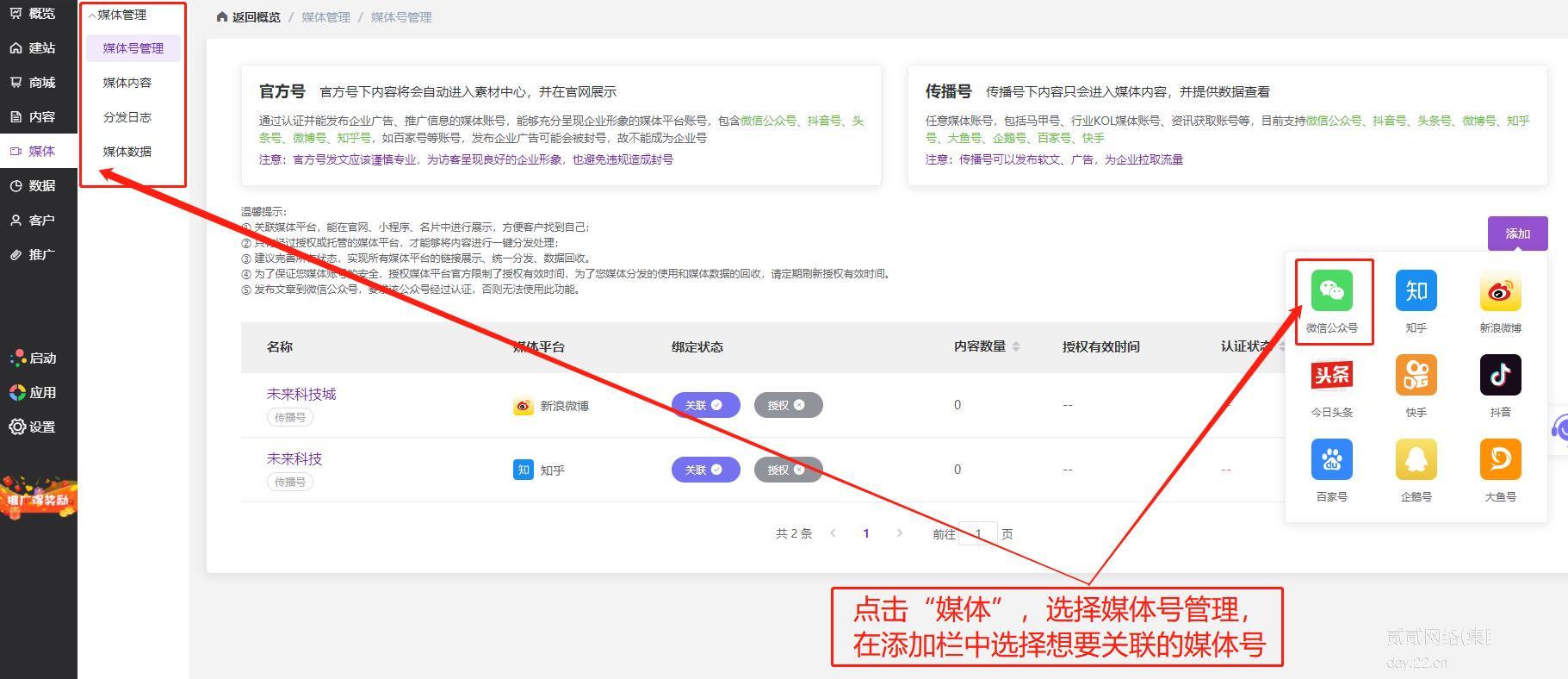 完成媒体号的关联和授权后,我们才能在官微中心中将营销物料一键分发至各大媒体平台,这一步是“生意进系统”的关键点之一。我们需要先关联媒体号,再进行授权。