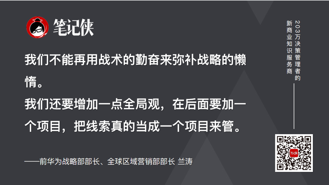 笔记侠筛选决策管理者最焦虑的问题,直接提问导师,剖析、改变和提升企业在科学决策、组织发展、营销增长的行为和结果,每周三晚8点常年推出,敬请关注 #视频号:笔记侠 。